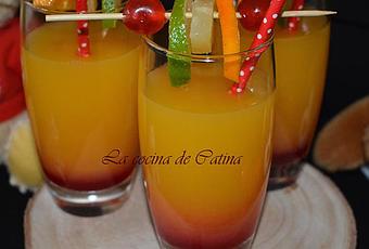 Adornamos las copas con las frutas preparadas, colocamos cada pincho de fruta haciendo equilibrio encima de cada vaso alto. Metemos 1 o 2 rodajas largas en cada copa y se sirve inmediatamente.Para un refresco de adultos podemos cambiar todo el zumo de piña por ginebra u otro licor que nos agrade.