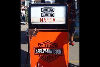 Uno de estos refrigeradores Vintage ha sido transformado en "surtidor de combustible" y decorado con logos de Harley Davidson, tiene manguera de carga en un lado y la "bocha" de la antigua bomba arriba.