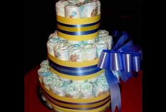 Nota: Para rematar el regalo, se puede ornamentar con un peluche en el tope de la tarta, calcetines de bebé, chupetes, etc.