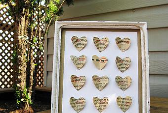 Aprovecharemos un periódico antiguo, y remarcaremos aquellas palabras o frases que queramos dedicar a esa persona a la que queremos mucho, nuestra pareja, un familiar, un amigo, un hijo..... Cortaremos, el trocito de papel donde esté la palabra que habremos subrayado, con forma de corazón. Buscaremos un marco que tengamos por casa, si no nos gusta el color, lo pintamos como queramos, podemos pegar un trozo de cuerda, cordón...alrededor del marco, como en la foto.