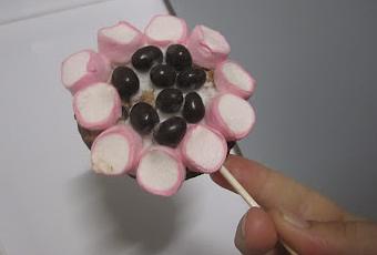 Una galleta cookie gigante comprada , a granel , en el Mercadona , nubes fileteadas, conguitos, palo de brocheta y ...¡Voilá! :
