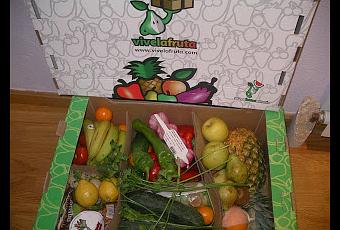 Que sorpresa! Es que no me lo esperaba. Pero cuando llega un mensajero a casa con una caja como esta llenita de fruta y verdura,... es para alucinar, no?