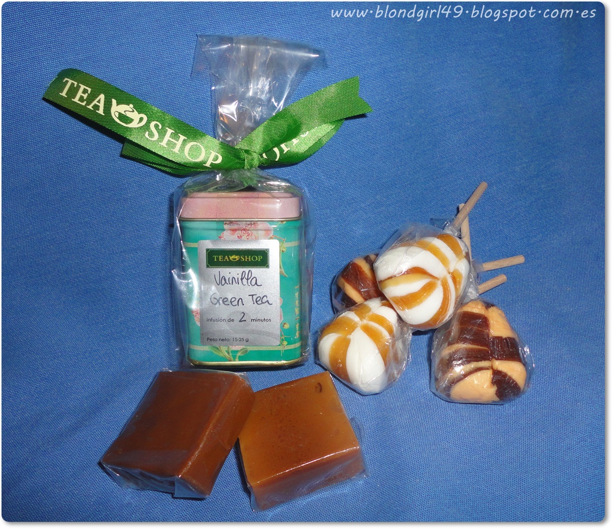 - Cajita de Vanilla green tea de la tienda Tea Shop, tengo que decir que soy una amante de los tés, sobre todo los que son de aromas dulzones o tipo té verde o té rojo. Tengo que decir que este es una delicia y estoy como loca cor el envase!!!- Choupettes de nuevos sabores de La Cuore Gourmande, ¡estaban de muerte! Hay 2 para mi chico y 2 para mi :)- Caramelos blandos, uno de café y otro de vainilla también de La Cuore Gourmande, son caramelos que se pueden masticar y están de muerte! El mío el de vainilla el de café para mi chico jiji