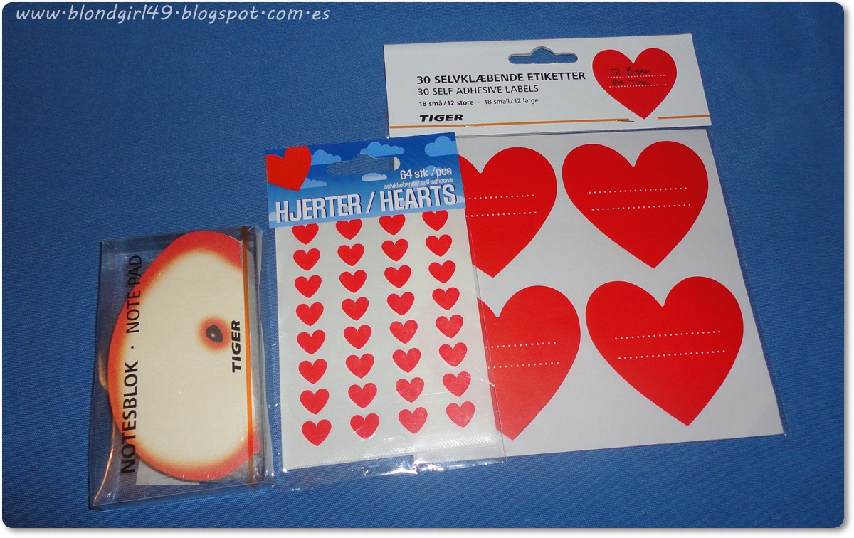 Cositas de Tiger, ya sabéis que todo lo de papelería ¡me vuelve loca! pues me cogió un blog de notas de manzana que queda cuquísima^^, pegatinas de corazoncitos que me vienen genial para poner en la agenda o si le hago alguna cosita al nene y las grandes también son pegatinas pero dentro se puede poner un nombre o un mensajito.