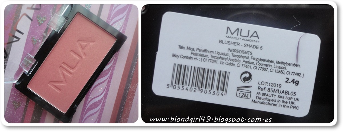 Este otro colorete es el Shade 5 de la marca MUA, es un tono rosado algo apagado pero también muy favorecedor, Tiene acabado un poco satinadito en tonos dorados, es bastante discretito si vamos con cuidado. Lo que sí he notado enseguida es que es bastante polvoriento y se nota que el envase no es demasiado bueno, siempre que quiero abrirlo me tiro mis 5 minutos largos... así que el ser una marca barata no es "porque sí" y también puede tener sus contras, aunque por el color y el acabado en la piel no tengo ninguna pega, a pesar de ser polvoriento con el dedo y en la brocha sobre la piel queda muy bonito y a mi me dura varias horas sin problemas.Contiene 2,4gr