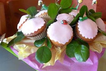 Las magdalenas pueden ser compradas o bien usar la receta de las de vainilla, aquí.Cuando tengamos frías las magdalenas podemos comenzar a decorarlas, para ello tenemos que teñir de rosa o el color que más os guste un poco de fondant blanco. Con un molde en forma ondulada o de flor cortamos y pegamos sobre la magdalena con un poco de pegamento comestible (muy poco).