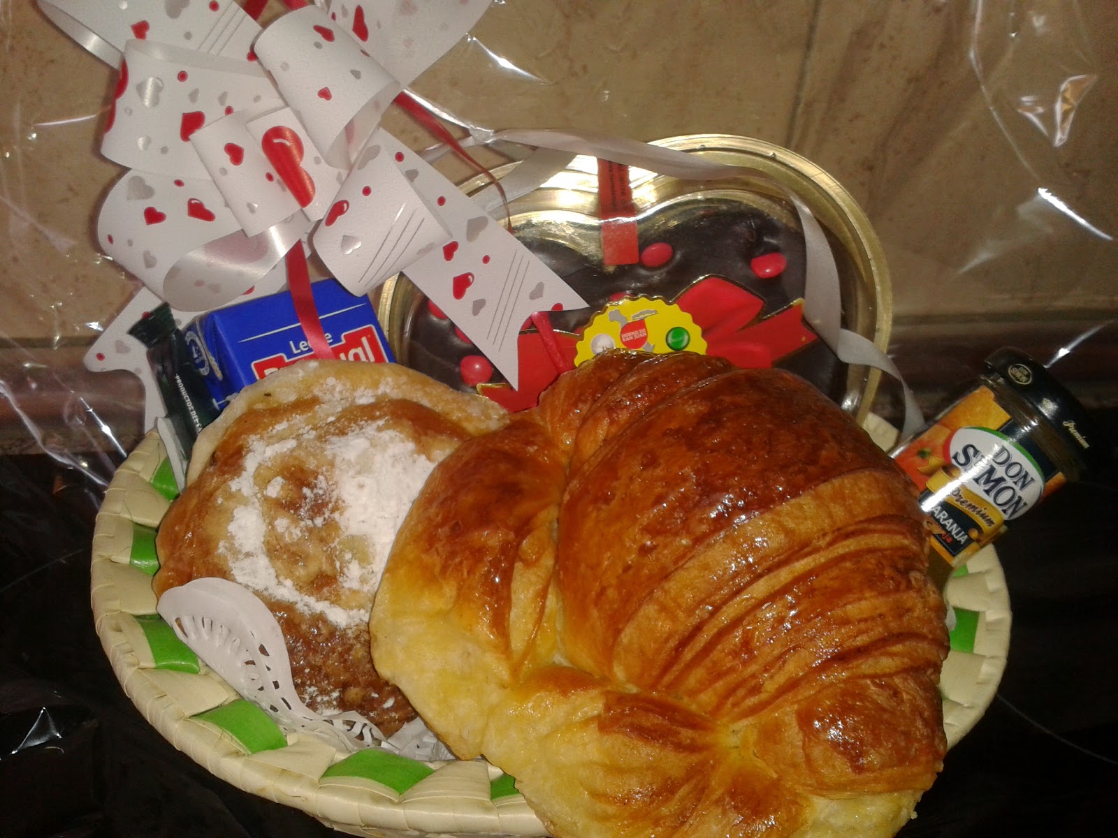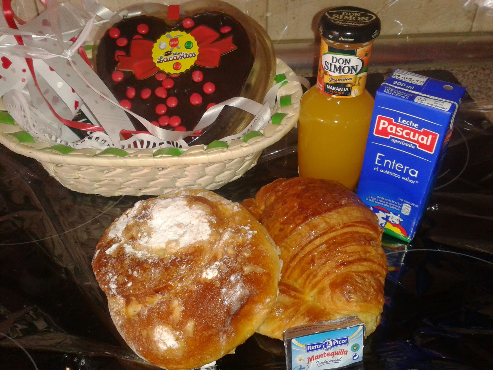 Bollería recién hecha, zumo, leche, café, tostaditas, una tarta de lacasitos .... una cesta así siempre es bienvenida.