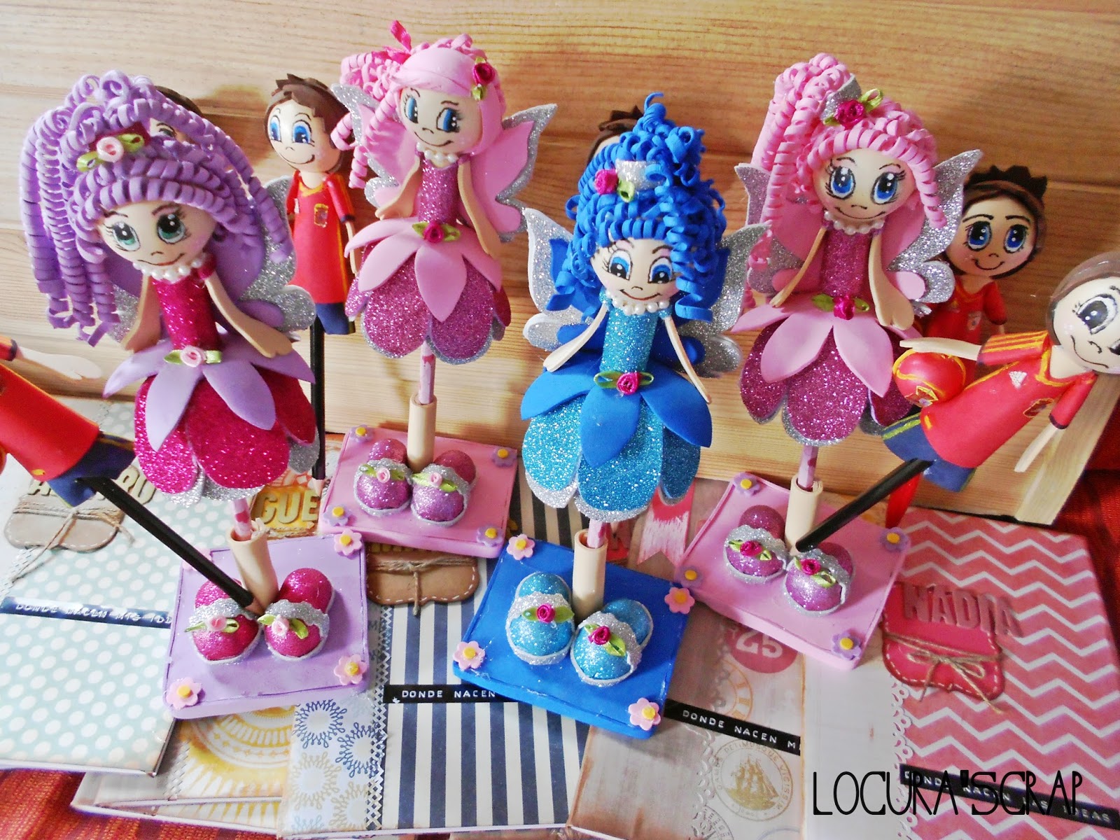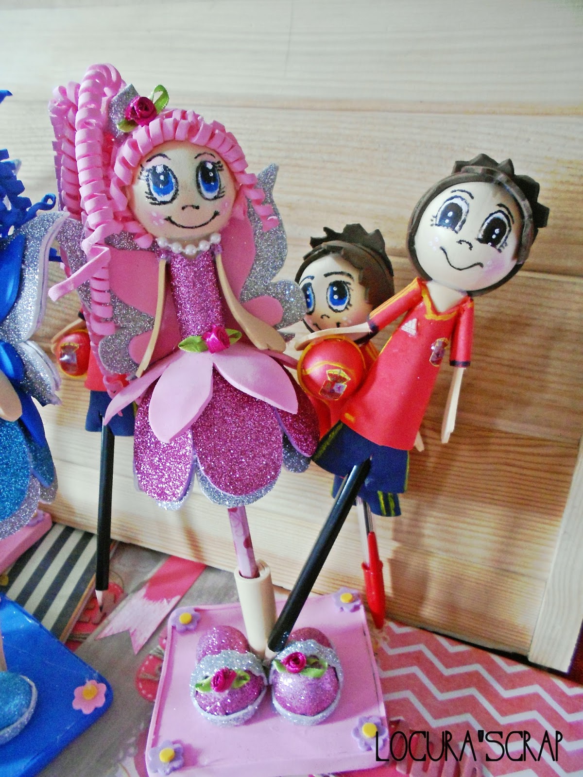 Y estos son los bolis , lapices fofuchos que nos hizo mi madre , son espectaculares verdad?Para las niñas ,unas preciosas hadas!! y a los chicos ,no podían ser otros que futbolistas con su balón y su traje de España, ¡que nonos! .