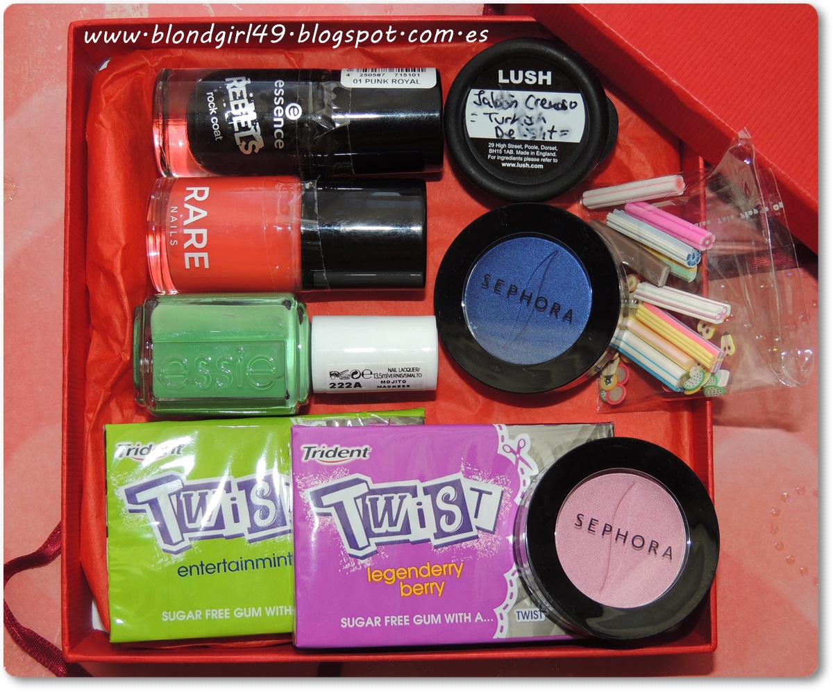 Había un montón de muestrecitas, una carta muy bonita y una caja roja preciosísima atada con un lazo y en el interior había:Os enseño todo por separado:Sombritas de Sephora:Me envió estas dos sombritas de Sephora, ya sabéis que me encantan y precisamente estos tonos no los tengo. Lo malo de las sombras es que normalmente las venden a 10,90€ así que hay que aprovechar cuando hacen la promoción de 3€ que así sí me parece un precio asequible. Encima ahora han sacado tonos nuevos y las han subido a 11,90€ dudo mucho que las vendan a este precio.- Sombra nº28 Sweet candy, es un rosita clarito con acabado perlado. Es monísima para looks de día en los que queramos tener una mirada más dulce, me encanta.- Sombra n140 My favorite jeans, es un azul Klein metalizado chulísimo, tiene un color muy potente y por el nombre recuerda al azul de los vaqueros. Esta sombra la veo más para usar de tarde-noche para un look más marcado y llamativo. También me ha encantado :)ESMALTE MOJITO MADNESS DE ESSIE:Este esmalte es el "Mojito Madness", es un verde menta precioso así que el nombre es muy adecuado. No tiene ningún tipo de brillo y se necesitan dos capas para que quede bien cubierta la uña. Queda un tono uniforme por toda la uña y además no tarda demasiado en secar. El pincel es planito tipo espátula así que ayuda a que nos pintemos más rápido las uñas. Había probado sólo un esmalte de esta marca pero el color no es que me guste demasiado, en cambio este es chulísimo para el verano y apenas tengo de este color^^ (en mi colección abundan corales, rosas, rojos, azules...).Contiene 13,5ml ESMALTE DE RARE NAILS:Este es el nº44 Firecracker que tiene un tono coral anaranjado, no tiene brillitos y es un color un poco transparentoso, se necesitan por lo menos dos capas para cubrir bien la uña (en la foto llevo dos y aún así transparenta un poco). Es el primer esmalte que tengo de esta marca y hacía tiempo que los quería probar porque los he visto por varios blogs. Encuentro que seca bastante rapidito así que no da pereza dar varias capas. El pincel es el de toda la vida, el cilíndrico, aún así yo me apaño bien. Contiene 10ml.ROCK COAT DE ESSENCE:Este es el top coat nº01 Punk Royal que sirve para modificar el color que nos hayamos puesto como color base, éste lo oscurece y además lleva incorporado glitters negros en forma hexagonal. La verdad es que me parece muy chulo este efecto aunque me hubiera gustado más que lo hubieran hecho con glitters más pequeñitos y bastante más cantidad, creo que el top coat sería mucho más sorprendente.Como top coat que es hace que el esmalte que llevamos nos dure más días intacto y este cumple su función, además también se seca rápido.Contiene 8mlEn la siguiente imagen podéis ver el top coat en acción:CHICLES TWIST DE TRIDENT:También me mandó estas dos cajetillas de chicles, todavía no había probado los Twist pero me han encantado. Uno es el de "Legenderry Berry" que tiene sabor a bayas, está muy rico. Y el otro es el entertainmint que tiene sabor a menta suave, también me ha encantado porque es menta dulce :D. Lo gracioso es que una vez que quitas el plástico (que los de la foto aún lo llevan) quedan fotos en blanco y negro con algún detalle en color xD son bastante graciosas^^JABÓN CREMOSO TURKISH DELIGHT DE LUSH:Como sabe que me gusta mucho la marca Lush me mandó esta muestra de un jabón cremoso que se llama turkish delight que nunca había probado. Tiene una textura cremosa y huele a rosas, deja la piel super suave así que me viene de maravilla porque soy de tener la piel seca^^, la verdad es que me ha encantado y no sabía que tenían jabones con esta textura :)DECORACIÓN DE UÑAS:Esto son barritas que se tienen que cortar muy finitas con la hoja de una cuchilla y así se pueden colocar en las uñas como decoración, había empleado algunas que me mandó Lucía pero estas también son muy cucas! a ver si me apaño cortándolas jajajaMUESTRECILLAS:- 2 muestras de Champú y 2 de Mascarilla reflejos rubios de Camomila Intea, ya las he empleado y me encantan, realmente he notado que se me ve el cabello más rubio, con tan sólo usar el champú y mascarilla una vez noté un cambio bastante grande, pero también he de decir que si usara este tipo de productos seguro que tendría el cabello rubio o también si tomara el sol, pero soy muy descuidada así que se me oscurece enseguida u.u'- 3 muestras de leche hidratante de Le Petit Marseillais, es una marca que me encanta, he probado geles y huelen taaan bien que dan ganas de tenerlos todos. Ya he probado las muestras y la verdad es que es una delicia, tiene un aroma muy suave a hidratante y la verdad es que me gusta muchísimo^^ además se absorbe muy rápido y deja la piel suavita. Lleva katiré, almendra dulce y aceite de argán. Algo que me encanta de algunas muestras como estas es que sale la foto del producto, encuentro que es muy útil porque así nos quedamos con la imagen del envase y la localizamos más fácilmente. - 2 muestras de toallitas quitaesmalte de Ioox skin, es la primera vez que oigo hablar de esta marca pero la busqué por internet y he visto que tienen muchísimos productos y se venden en farmacias, parafarmacias y centros especializados. Este tipo de quitaesmalte me ha parecido muy curioso por su formato. Por el momento no las he usado porque quiero esperar a probar con un esmalte difícil de quitar (los que llevan glitters) pero por el momento sólo me he pintado con esmaltes normales. Son sin acetona así que pintan bien, ya os contaré :D- Perfumes Sunset y Sea de Women'secret- Muestras de base de maquillaje de Sephora, como son del 02 y 03 mejor me los guardo porque dudo mucho que sean de mi tono, quizás en verano llegue al menos al 02 jajaja¿A qué es una preciosidad de regalitos? ¿no os parece un detalle super bonito? ¿habéis probado algo?Un besito muy grandote, ¡feliz jueves!