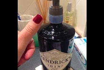 Hace poco encontré en casa una botella de Ginebra Hendrick's vacía, y se me ocurrió rellenarla de jabón y hacer de ella un dispensador de jabón para lavarse las manos.
