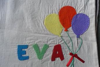 Pues contando con estos materiales, me puse a buscar por internet. Con la mochila tenía claro lo que iba a hacer. Le puse unas aplicaciones en fieltro, con el nombre de la niña y unos globitos. Quedó tan mona!