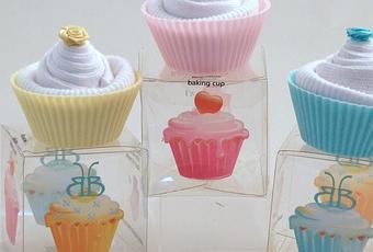No creáis que me he confundido y que en vez de hablaros de moda infantil os voy a dar una receta de repostería. Los deliciosos cupcakes que veis en las fotos no son lo que parecen, cada cupcake es en realidad un par de calcetines para bebé, eso sí, el molde de silicona para magdalenas en el que se presentan es real y lo podéis utilizar para hornear en casa.
