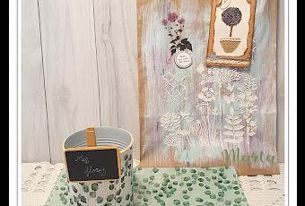 La bandeja es normalita, simple decopage sobre cristal, la lata lleva el decoupage sobre cartón corrugado pegado en la lata, era la primera vez que lo hacia y me encantó el resultado, aunque es complicadillo que quede bien metido en todas las ranuras creo que lo conseguí.Y lo que me encantó hacer fue la decoración de la bolsa, me parece que quedó preciosa.Primero pinté con varios tonos de pintura, luego le puse un estencil con volumen, un salpicado y un stiker de flores junto con una frase muy cierta.La etiqueta tambien me gustó mucho cómo quedó, un macetero con un arbolito hecho con semillas de lavanda, añadiendo detallitos y el resultado ya me direis si os gusta.Espero que os guste tanto como a Tania.