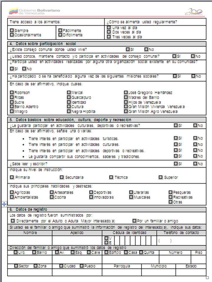 Planilla registro Gran Misión en Amor Mayor Venezuela.docEl registro de la Gran Misión En Amor Mayor, que inicio en los estados Vargas, Miranda y el Distrito Capital, con el objetivo de brindar una pensión de vejez a los adultos mayores en situación de pobreza, tendrá una duración de 60 días hábiles, informó el presidente del Instituto Venezolano del Seguro Social (IVSS), Carlos Rotondaro.Durante el programa Toda Venezuela, que transmite Venezolana de Televisión (VTV), Rotondaro señaló que en esta jornada se han habilitado 163 centros de registro (360 puntos), los cuales contarán con más 1.700 efectivos de la Fuerza Armada Nacional Bolivariana (FANB), quienes garantizarán el orden y brindarán una atención integral al adulto mayor.El registro de las mujeres con edad igual o mayor a 55 años, y los hombres con edad igual o mayor a 60 años, se realizará de acuerdo a la terminación del número de cédula de la siguiente manera: lunes 1 y 6; martes 2 y 7; miércoles 3 y 8; jueves 4 y 9; viernes 5 y 0, y sábados sin restricción de cédula."Hemos estado trabajando en función de que esta misión sea estructural, es decir que pueda atender no sólo la asignación económica, sino otros problemas como salud, vivienda", dijo.El horario de atención a las personas en el registro será de lunes a viernes, de 8:00 de la mañana a 6:00 de la tarde y los sábados de 8:00 de la mañana a 1: 00 de la tarde. Este censo se realizará en las sedes de la red de infocentros, del Instituto Nacional de Servicios Sociales (Inass) y los centros del IVSS.Los requisitos para el registro son: nacionalidad venezolana, extranjeros con 10 años de residencia en el país, cédula laminada, ingresos familiares que estén por debajo del salario mínimo (Bs.1.548).Rotondaro destacó que los adultos mayores con edad superior a los 80 años y que tengan algún impedimento para trasladarse a los centros de registro pueden ser censados por los familiares con la respectiva cédula de identidad del beneficiario.Luego del registro se hará la visita casa por casa, para constatar las condiciones en las que se encuentren las personas registradas.Fuente: