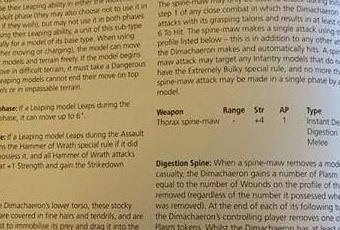 Desde la pagina de FB Mexican ork tenemos una foto que tiene las reglas,perfil y puntos del Dimacheron Tiranido,una nueva criatura tiranida,esculpida por Trish Carden para Forge Wolrd,que ha sido presentada en el Warhammer 40K Open Day que sale en en la nueva edición del Imperial Armour 4.Lo que me ha llamado la atención(A mi y a muchos mas) es su coste para la figura que es y las reglas que tiene.200 puntos para un ejército como el Tiranido y viendo sus reglas es un coste bastante bajo,creo yo.