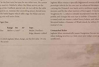 Antes de encarar la recta final del día de hoy, una imagen que me ha pasado Skie al mail y que viene a completar lo que salio ayer en esta entrada. Son las reglas especiales y propias del Primarca de los Cicatrices Blancas,Jaghatai Khan y que salen en el siguiente libro de la herejía de Horus de Forge World, Malevolence, que parece que esta llegando a los que hicieron la pre-compra.