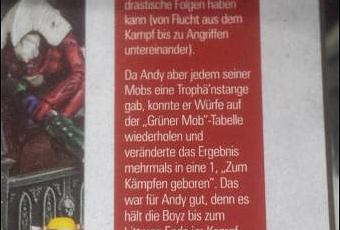 Because Andy bought every of his mobs a bosspole, he was able to reroll on the green mob table and changed the result several times to a 1 'born to fight'. This was good for Andy, because this keeps his boys till the bitter end of the fight. (In the end they want to have the loot, does matter if some of them die?) This really changed the game, because one or two brave ork-warriors bound whole tides of tyranids in close combat."