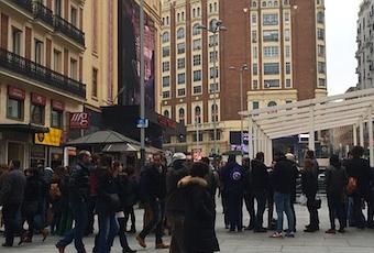 Los viandantes que pasaron el pasado domingo 12 de enero por la Plaza de Callao de Madrid a partir de las 4 de la tarde se encontraron con una larguísima cola que daba la vuelta a la plaza. -Disculpa, ¿qué es lo que hay? -Un pase con las tres películas de Regreso al futuro. -Ah, gracias.