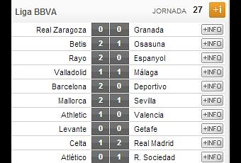 La jornada 27, que nos devolvió a la bipolaridad, culminó ayer lunes con tablas sin goles para el Zaragoza y el Granada. Bipolaridad a la que regresamos, de la manera acostumbrada, con Messi y Cristiano Ronaldo sacando adelante a sus equipos: tenemos el honor de ver semana a semana a los dos mejores jugadores del mundo, por si fuera poco, en el hogar de los Campeones de Europa y del Mundo de Futbol.
