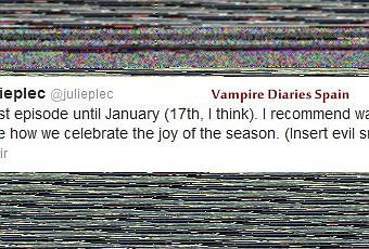 Como ya sabéis, esta noche se emite en Estados Unidos el último episodio antes del parón por vacaciones de Navidad. ¿Cuándo regresará la emisión? Parece ser que el primer episodio del 2013 se emitirá el 17 de Enero, según ha twitteado la misma Julie Plec hace unos minutos.