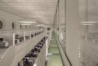 La transformación de la planta basamental ha puesto en valor los espacios originarios para incorporarse a las necesidades actuales y cambiantes. El potente muro longitudinal paralelo a esta fachada se ha reforzado estructuralmente y en él se apoya una ligera entreplanta volada que aloja puestos de trabajo en una situación privilegiada de vistas. Las ménsulas y barandillas originales de forja se reusan pintadas de blanco y el techo estructural de casetones de acero, antiguo blindaje interior, se descubre como una sorpresa tras la demolición de los viejos falsos techos funcionales.