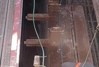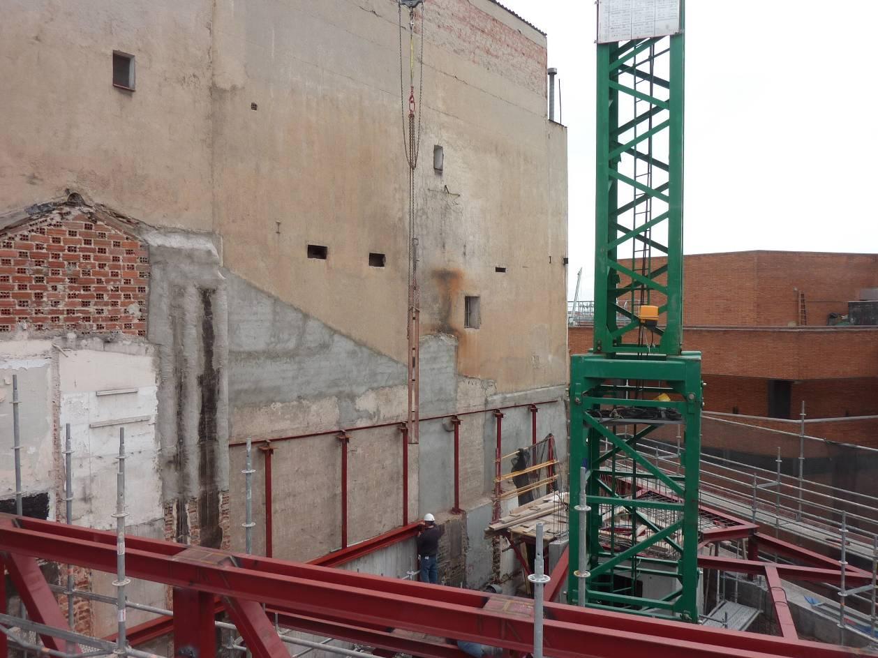Una vez colocadas las vigas de la planta peine, se continúa con la demolición del muro de embocadura, terminando de demoler la viga de hormigón armado, y pasando a la demolición del resto de muro formado por fábrica de ladrillo, arriostrado con vigas de madera intermedias.
