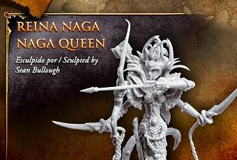 "Para Warthrone llega un nuevo personaje para Elfos Oscuros, una Reina Naga. Las Nagas se encuentran en lo más alto de la sociedad Banir, donde son adoradas como los seres más puros de su raza. Cada Naga es elegida personalmente y creada por la misma Némesis, de entre las más fuertes y mortíferas de poder de sus seguidoras. Aquellas Elfas Oscuras que son elegidas, deben pasar una serie de terroríficas pruebas para poder convertirse en una Naga... aquellas que fallan, son transformadas en formas horribles, las Execradas de Némesis".