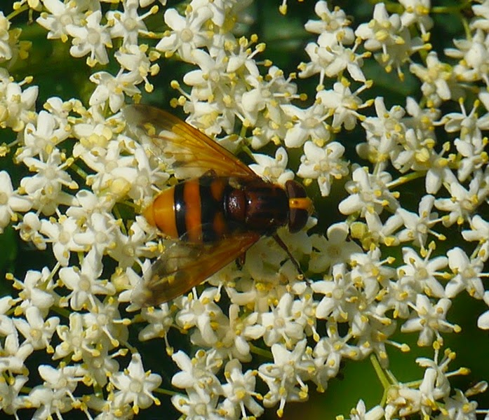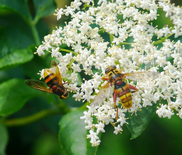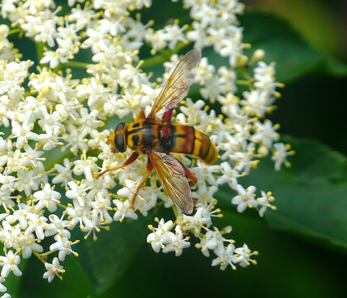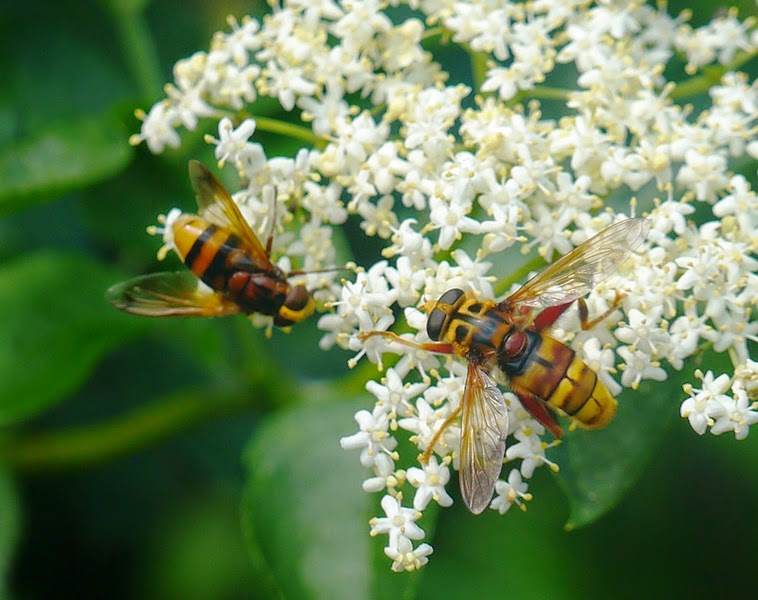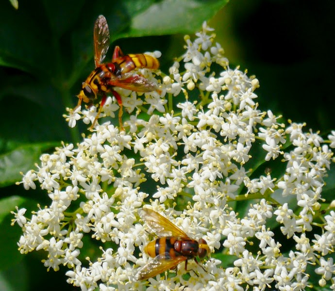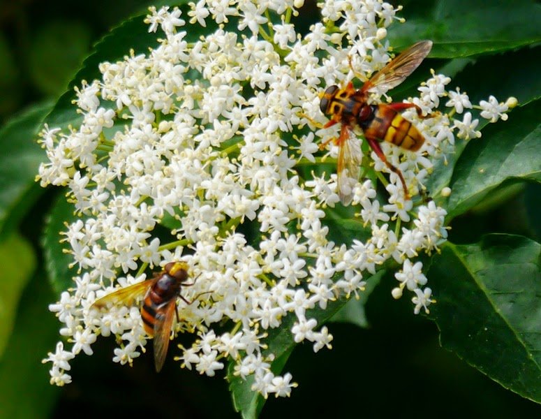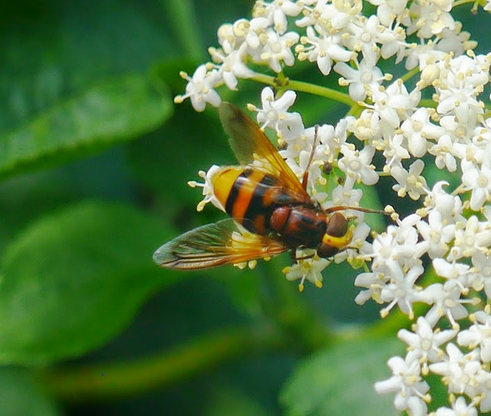 Por su parte, Milesia crabroniformis es aún más grande, es el mayor sírfido de Europa, alcanzando los 2,5 cm. Sus larvas se alimentan de madera muerta y los adultos lo hacen en las flores, como todos los sírfidos, por mi experiencia sé que les gusta especialmente el hinojo.