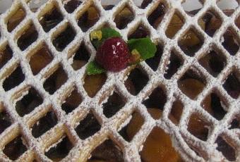 Con otra plaquita de hojaldre hacer un enrejado. Pincelar con huevo y cocer unos 10-15 minutos, hasta que esté dorado. Retirar del horno y dejar enfriar. Manipular con mucho cuidado para que no se rompa Salpicar abundantemente la reja con azúcar glas y colocar sobre el hojaldre y la compota. Servir. Se pueden hacer individuales. La compota puede dejarse preparada un par de días antes y el hojaldre puede hornearse el día anterior.