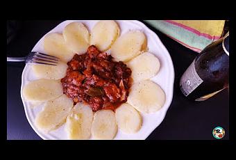 3.- Lavamos las patatas (papas) las cocemos con agua hirviendo y sal durante 40 o 45 minutos hasta que estén tiernas. Las dejamos templar y le quitamos la piel. Servimos las potas con las papas cortadas en laminas salpimentadas al gusto.