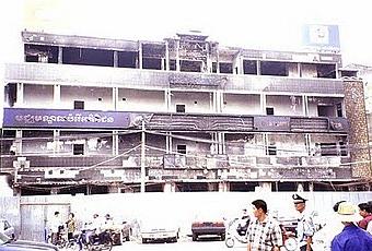 Así quedó la Embajada de Thailandia en Phnom Penh tras las manifestaciones de 2003. Y es que no se pueden tener embajadas inflamables en países vecinos con los que te llevas mal