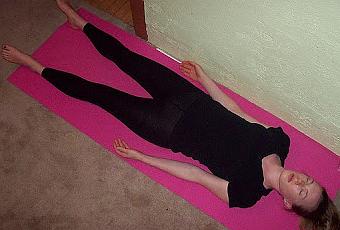 Nos tumbamos boca arriba con las piernas abiertas hasta llegar a la anchura de las caderas. Relajamos el cuello y la nuca. Ponemos los brazos paralelos al cuerpo estirado.