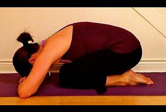 Nos arrodillamos sobre el suelo y bajamos los glúteos hacia los talones. Arqueamos la espalda y apoyamos el tórax sobre los muslos. La cabeza también está arqueada, apoyando la frente en el suelo. Los brazos y las piernas están relajados. Las palmas de las manos miran hacia arriba. Dejamos los hombros caídos, relajados, hacia delante. La columna vertebral dibuja un gran arco.