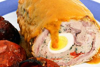 Preparar vuestros propios fiambres nunca fue tan fácil:Ingredientes (para el rollo):-1 falda de cerdo (500 g aprox)-300 g de carne de pollo picada-2 huevos cocidos-125 g de bacón-3 pimientos del piquillo-pimienta-perejil-2 dientes de ajo1-Picar el diente de ajo, el perejil y los pimientos del piquillo. Mezclarlos con la carne de pollo.2-Extender la falda de cerdo, cubrirla con tiras de bacón, con la carne picada y los huevos cocidos por último. Enrollar bien apretado, y cerrar con una red, o coser con una guita.Ingredientes (para la salsa):