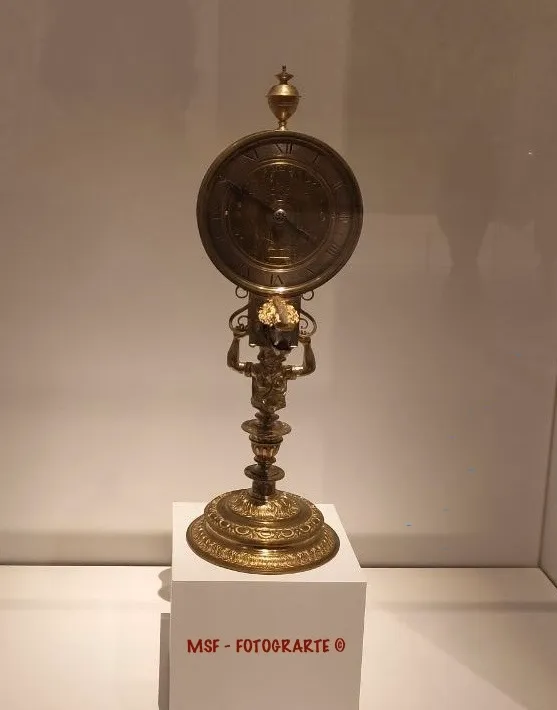 The clock is part of the important collection of mechanical and scientific objects that Philip II collected. It is the work of the Flemish clockmaker Hans de Evalo, who served the King from 1580 until his death. It is one of the first examples of a night clock made in Europe. Monstrance-shaped, it has a single chiseled steel hand. The German-style mechanism consists of round plates, a spring motor, a one-day winding, a snail drive, and a folio escapement with oscillation regulator. Surrounding it is the container for the oil that feeds the oil lamp.
