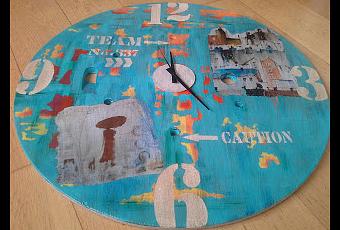 Volvemos a trabajar sobre una bobina de cable de 70cm de diámetro para realizar un reloj. Esta vez quería probar una técnica mixta combinando relieves, pintura, estarcido y decoupage.