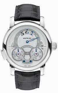 Un nuevo calibre manufacturado por Montblanc con un mecanismo día y noche patentado. Esta esfera poco común, que se ha podido conseguir gracias al nuevo calibre de manufactura MB R220, cuenta con un elaborado mecanismo patentado que consiste en dos discos giratorios colocados uno por encima del otro. Los números arábigos del 1 al 12 están recortados sobre el disco superior. Este disco de doce horas gira por encima del disco bicolor de día y noche, que es mitad color azul pálido y mitad negro, de modo que aparece una tonalidad clara u oscura en el número de fondo visible de la ventana, según las horas sean de día o de noche. El disco de doce horas gira continuamente, mientras que el disco de día y noche gira a intervalos y a distintas velocidades para crear el cambio de color deseado (azul pálido de noche y negro de día) en los números esqueletizados. La complejidad de este movimiento se controla gracias a un mecanismo de Cruz de Malta formado por dos ruedas engranadas conjuntamente. Una de estas levas está montada sobre el eje propulsor del disco del día y noche, el otro va fijado a una extensión del eje de las horas. Cada uno de los perfiles de las levas tiene una forma especial para que giren al ralentí al sobrepasarse entre las 9 h y las 15 h (y, de nuevo entre las 21 h y las 3 h); el disco de día y de noche no se mueve durante estos dos intervalos. El engranaje de las ruedas se inicia a las 3 h (y a las 15 h). Este engranaje fuerza que el disco de día y noche gire cada vez más rápido hasta que los dientes de un lado y de otro se ajusten de un modo en que el disco de día y noche ya no se acelere si no que sigue girando en sincronía con el disco de doce horas (lo que ocurre desde las 4,30 h a las 7,30 h y desde las 16,30 h a las 19,30 h). Después, el disco de día y noche se desacelera entre las 7,30 h y las 9 h (y entre las 19,30 h y las 21 h) hasta que el engranado queda totalmente separado, que es cuando el disco de día y noche se detiene del todo.