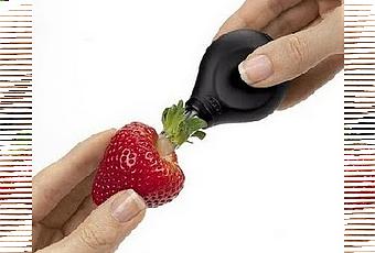 El OXO Huller se intrduce el parte superior de la fresa donde brotan las hojas, una vez traspasado el centro, se tira hacia atrás, removiendo el tallo y las hojas.