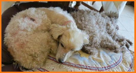 Fueron días de educar, de enseñarla para que pudiera solita volver a sonreir con la ayuda de todos nosotros, una familia entera con una tarea caótica cuando traia tanta tristeza de su vida en el abandono. Marcelo se asombraba de que todo ese sufrimiento aun lo vivía en sus sueños cuando dormía a saltos. De a poco se fue adentrando amistosamente con los perros dueños de casa, pausamente sin que nadie se diera cuenta se fue ganando a la Kitty, la perra mas viejita de mi jauría, acercarse a su cama, a dormir durante el día a su lado. Kitty como es sordita y ciega, aceptó ese calorcito en su espalda sin quejarse. Pasó a ser la dama de compañía.