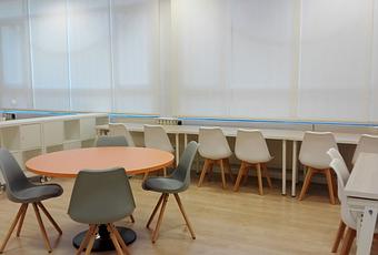 @ayudaadecorarNuestro trabajo era conseguir luminosidad, ya que aunque el local contaba con unos grandes ventanales, los paneles en color verde no dejaban pasar la luz. Al tratarse de un espacio público y ser el aula de informática necesitábamos un material resistente, que dejase entrar la luz y al mismo tiempo filtrara los rayos solares, para no molestar a las pantallas de los ordenadores, así que optamos por hacer unos paneles japoneses o deslizantes "a medida" en screen (el mismo material que empleamos en los estores enrollables) en un tono blanco natural.