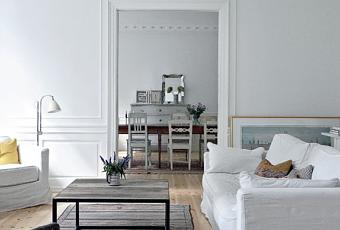 Me encanta esta casa Nórdica de techos altos, grandes ventanales y en el que el blanco hace que el mobiliario antiguo realce aún más. La madera natural del suelo llega hasta la cocina unificando los espacios. Gran parte de los muebles han sido comprados en el mercado de las pulgas de París, por eso se respira ese suave aire Francés en la casa.