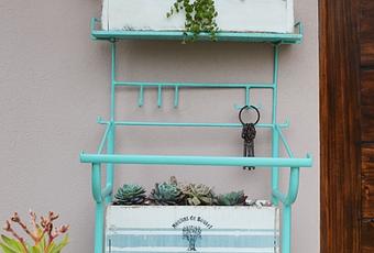 Mantuve un color aguamarino suave y esta vez le agregué el número de casa, me pareció quedaba divertido! Como las macetas de plástico decoupageadas ya no querían saber más nada (ni yo de ellas!) las cambié por unos cajones VP. Abajo usé uno de los Grains rayados, y arriba sumamos un estante y otro cajoncito de madera, todo a medida hecho por mi carpintero preferido ♥.