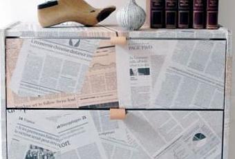 Si buscas una manera de renovar un mueble puedes conseguir un aspecto original forrándolo de papel de periódico. Cola, periodicos viejos y una brocha plana han sido los materiales necesarios para dejar así de bonita esta cómoda Rast de Ikea.