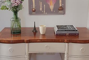 Inés vive cerca de casa, me seguía en Instagram pero se enteró comprándole flores a Gaby de @floresporquesi que tenía tan a mano la posibilidad de renovar un mueble del que no era muy fan. Hablamos en Diciembre y quedamos que a su vuelta de vacaciones, me traía este escritorio que era de la abuela de su marido y que hacía rato le hacía ruido en su casa, pero que por otro lado, no podía deshacerse de él.
