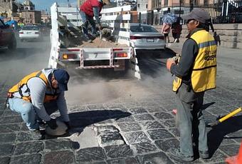 Las cuadrillas realizaron trabajos de rehabilitación del adoquín, corrigiendo afectaciones que obstaculizaban el tránsito y generaban complicaciones a los vehículos que diariamente circulan por esta vialidad, considerada uno de los puntos estratégicos del primer cuadro de la Capital.