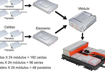 El Nissan Leaf de 40 kWh monta una batería HV con una configuración de 24 módulos con 2 elementos cada uno. Cada elemento dispone de 4 celdas con una configuración de 2 conexiones en serie de 2 celdas en paralelo. Cada celda tiene un voltaje nominal de 3,75 V y una capacidad de 56,3 Ah.