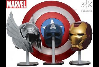 eFx Collectibles, responsable de varias réplicas de grandes franquicias cinematográficas o series de televisión como La Guerra de las Galaxias, Star Trek o Battlestar Galactica, ha adquirido recientemente los derechos para crear replicas basadas en las propiedades de Marvel Comics. Con el estreno de Los Vengadores casi encima, la primera línea de réplicas de la compañía estará basada en la película de Joss Whedon, y estará formada por los trajes, las armas y otros objetos. Gracias a CBR, más abajo tenéis la primera imagen que nos muestra las réplicas de los cascos del Capitán América, Thor y Iron Man, así como del escudo de vibranium del Capi. En boca del presidente de eFx, Bryan Ono: