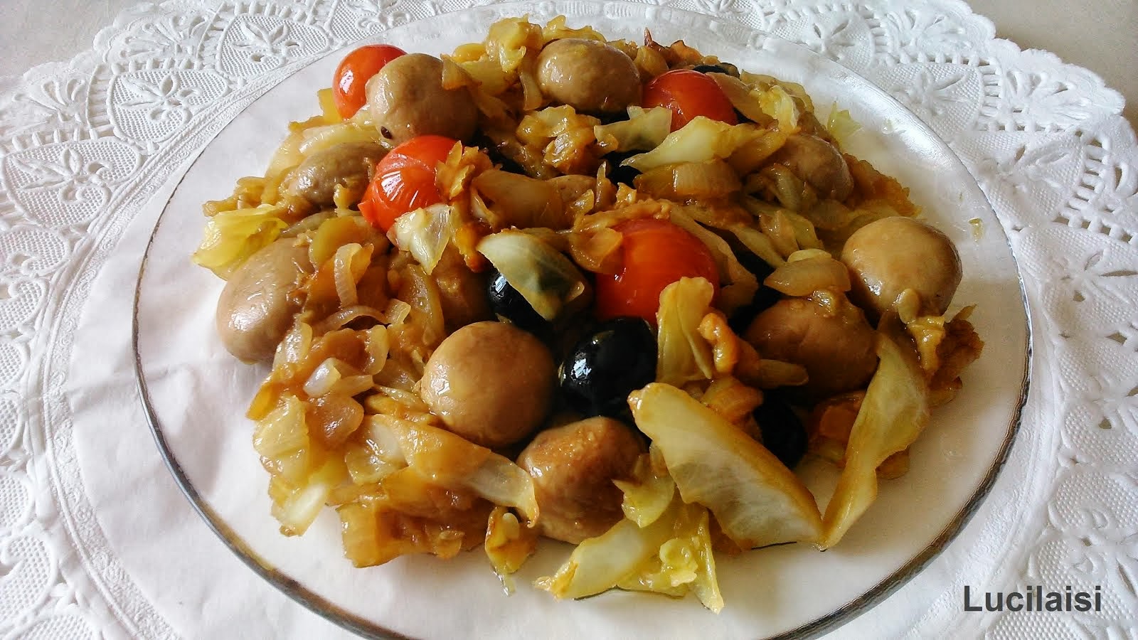 - Añadimos el calabacin, el repollo,los tomatitos, las aceitunas negras y la sal.