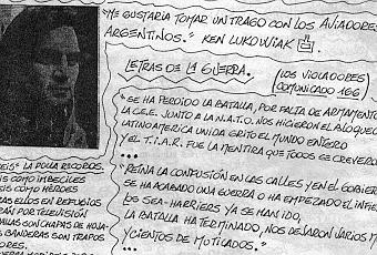 -Si volvieras a nacer, ¿serías paracaidista?No, sería mujer, para jugar con mis tetas.-¿Cómo viviste la batalla de Ganso Verde?Es como haber tomado LSD. Estuve deambulando por el campo de batalla como en un viaje, en esos espacios abiertos y desolados, donde la batalla se descomponía en cientos de pequeños combates. Marchaba sin saber si esos puntos negros que se alejaban eran ingleses o argentinos, sin comprender cómo un arbusto puede caminar y convertirse en francotirador. Si la Thatcher y Galtieri, esos dos criminales orgánicos hubieran estado ahí, habría cesado inmediatamente ese aluvión de barro, mierda, sangre, fuego y miedo. La guerra es enferma. - ¿Tenían chances los argentinos, Ken?¡Vamos! Todas. Pudo haber sido un paseo para ellos, tenían una excelente artillería, su fuego estaba bien coordinado y dirigido. Las trincheras estaban hechas y posicionadas como de manual... Pudieron habernos hecho mierda.- ¿Entonces?No sé. Nosotros estábamos mejor entrenados. Mejor condicionados. Nos habían lavado mejor el cerebro. Teníamos la absoluta convicción de que íbamos a ganar. Los soldados argentinos estaban solos, abandonados... Así no podés ganar. Sin liderazgo no vas a ningún lado.- ¿Por qué cosas peleaban ustedes, Ken?Por seguir viviendo, nada más que por eso. Cuando la batalla empieza te olvidás de si son las Malvinas, Falkland, argentinas o inglesas. De la jodida reina, ¡pelotas!No hay otra cosa que seguir viviendo......................................................................................................Sólo sé esto, por favor escuchen: si alguna vez llegan a sentir que tienen que quitarle la vida a un hombre, ya que su causa parece perdida, traten de no matarlo por la espalda y a tres metros de distancia. Siéntense a su lado, tomen su mano, pídanle a Dios comprensión y métanle una bala en el cerebro. Pero asegúrense de que es el lado izquierdo porque controla al derecho. Con frecuencia pienso en lo que vi, ese día, por lo general cuando estoy solo y me lleno el cuerpo de cosas para aliviar mi dolor y sentirme más cuerdo. Para convencerme todavía de que soy un hombre bueno le pido a dios que cuide a la madre del muchacho de la herida en la cabeza. El muchacho con un solo ojo, tirado, llorando, muriéndose, de la Argentina. Amén.Fanzine Mundo In-Mundo. Buenos Aires, Argentina, 1993.