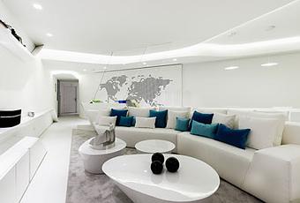 La iluminación artificial en las zonas comunes se ha resuelto con un foseado en forma curva que guarda una fila de luz Led, de modo que proyecta la luz de forma tenue e indirecta. El minimalismo en el diseño de los ambientes se ve acompañado por el mobiliario elegido con tapizados en color blanco y acabados de encimeras, mesas y aparadores en madera lacada color blanco brillo.